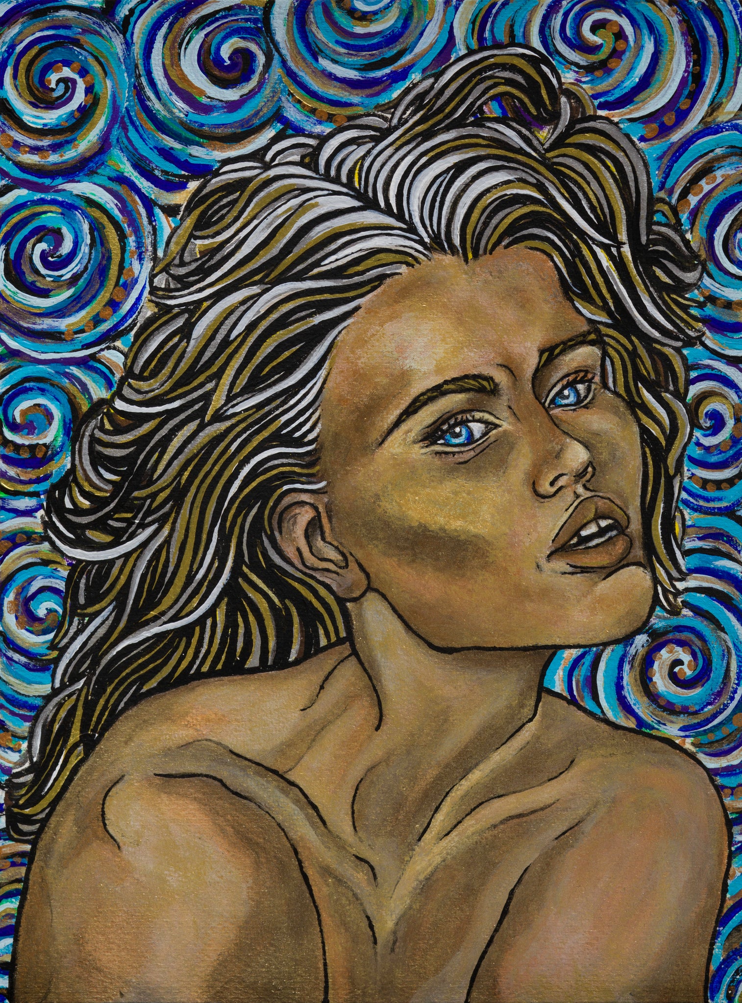 Dive into the captivating depth of "L'abisso di Venere" (Venus's Abyss), a stunning art print that celebrates personal transformation, feminine mystique, and the profound power of memory. The original painting was realized by Gaia Pulliero, an Italian young painter.